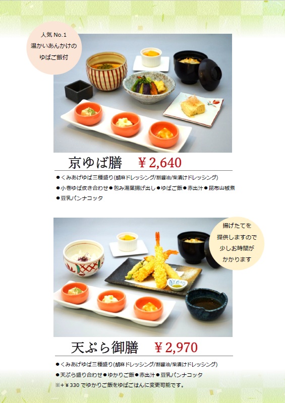 ゆばご飯・赤出汁・包み湯葉揚げ出し・冷やしゆば・香物 ・豆乳パンナコッタ |